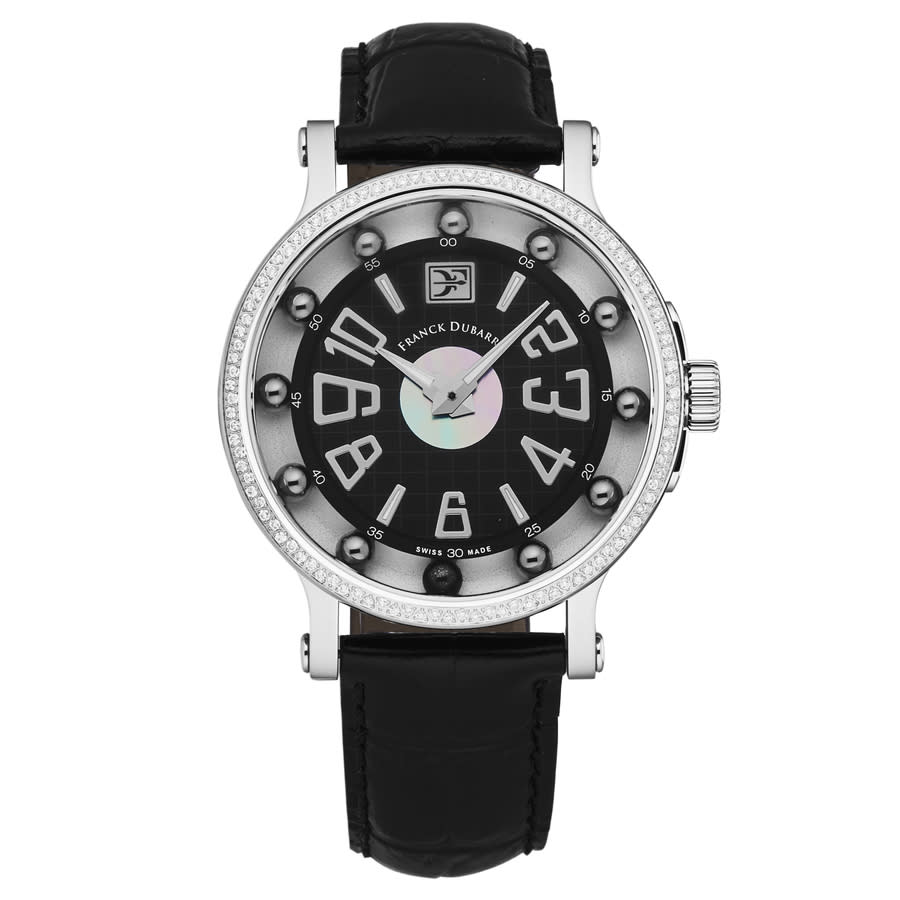 Silver-tone stainless steel case with a black leather strap. Fixed silver-tone stainless steel bezel. Black dial with silver-tone hands and Arabic numeral hour markers. Dial Type: Analog. Quartz movement. Scratch resistant sapphire crystal. Pull / push crown. Solid case back. Round case shape, case size: 42 mm, case thickness: 12 mm. Band width: 20 mm, band length: 8 inches. Tang clasp. Functions: hour, minute, second. Crazy Balls Series. Luxury watch style. Watch label: Swiss Made. Franck Dubarry Crazy Balls Black Dial Ladies Watch CB0307.