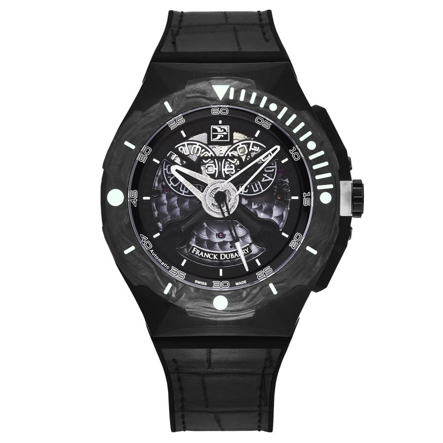 Black-plated stainless steel case with a black rubber strap. Uni-directional rotating black-plated bezel. Black dial with silver-tone skeleton hands and index hour markers. Arabic numeral minute markers (at 5 minute intervals). Dial Type: Analog. Date display. Automatic movement. Scratch resistant sapphire crystal. Screw down crown. Solid case back. Round case shape. Case size: 43 mm. Case thickness: 13.7 mm. Band width: 26 mm. Band length: 8 inches. Fold over clasp. Water resistant at 300 meters / 1000 feet. Functions: hour, minute, second. Diver Series. Luxury watch style. Watch label: Swiss Made. Franck Dubarry Diver Automatic Black Dial Mens Watch DIV-01.