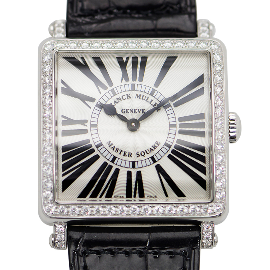Stainless steel case with a black (alligator) leather strap. Fixed stainless steel set with diamonds bezel. Silver dial with Roman numeral hour markers. Minute markers around an inner ring. Dial Type: Analog. Quartz movement. Scratch resistant sapphire crystal. Screw down crown. Solid case back. Square case shape. Case size: 32.7 mm. Tang clasp. Water resistant at 30 meters / 100 feet. Functions: hour, minute. Additional Info: original box, manual (complete accessories). Master Square Series. Luxury watch style. Watch label: Swiss Made. Franck Muller Master Square Quartz Diamond Silver Dial Unisex Watch 6002 M B QZ R D 1R (AC).