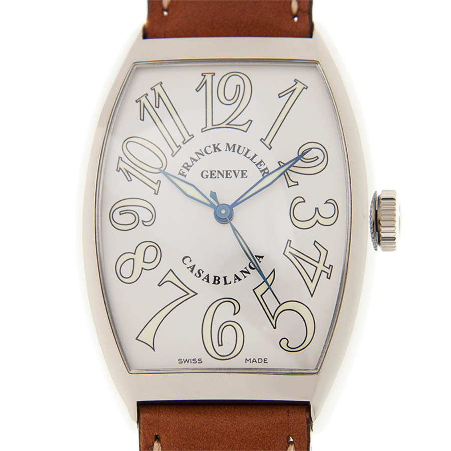 Silver-tone stainless steel case with a brown alligator band. Fixed silver-tone stainless steel bezel. White dial with blue sword-shaped hands and Arabic numeral hour markers. Dial Type: Analog. Automatic movement. Scratch resistant sapphire crystal. Screw down crown. Solid case back. Tonneau case shape. Case size: 34 mm. Pin buckle clasp. Functions: hour, minute, second. Additional Info: original box, international warranty card, manual (complete accessories). Luxury watch style. Watch label: Swiss Made. Franck Muller Cintree Curvex Automatic White Dial Unisex Watch 6850 M C CASA BLANCA (AC).