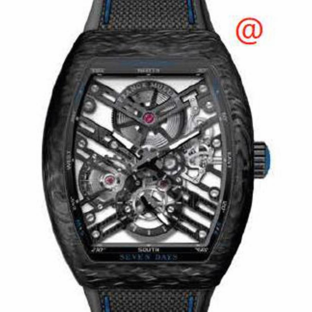 Black polycarbonate case with a black leather strap. Fixed black polycarbonate bezel. Transparent dial with black hands and index hour markers. Dial Type: Analog. Luminescent hands and markers. Hand wind movement. Scratch resistant sapphire crystal. Transparent see through case back. Tonneau case shape, case size: 41 mm. Functions: hour, minute, second. Additional Info: original box, international warranty card, manual (complete accessories). Seven Days Series. Luxury watch style. Watch label: Swiss Made. Franck Muller Seven Days Hand Wind Mens Watch V41S6SQTCARBONBL(NRGRIBL).