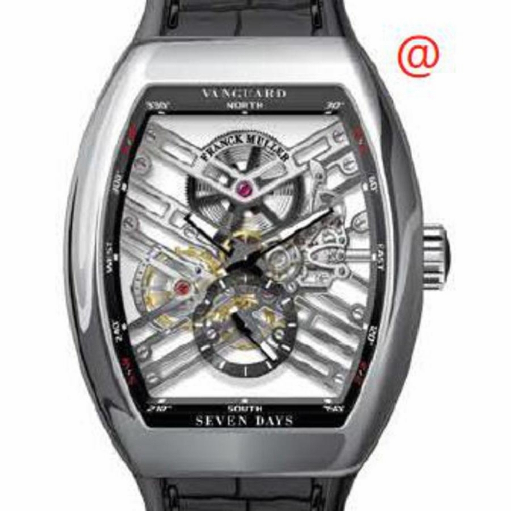 Silver-tone stainless steel case with a black leather strap. Fixed silver-tone stainless steel bezel. Transparent dial with black hands and index hour markers. Dial Type: Analog. Luminescent hands and markers. Hand wind movement. Scratch resistant sapphire crystal. Transparent see through case back. Tonneau case shape, case size: 45 mm. Functions: hour, minute, second. Additional Info: original box, international warranty card, manual (complete accessories). Seven Days Series. Luxury watch style. Watch label: Swiss Made. Franck Muller Seven Days Hand Wind Mens Watch V45S6SQTACNR(NRBLCRGE).