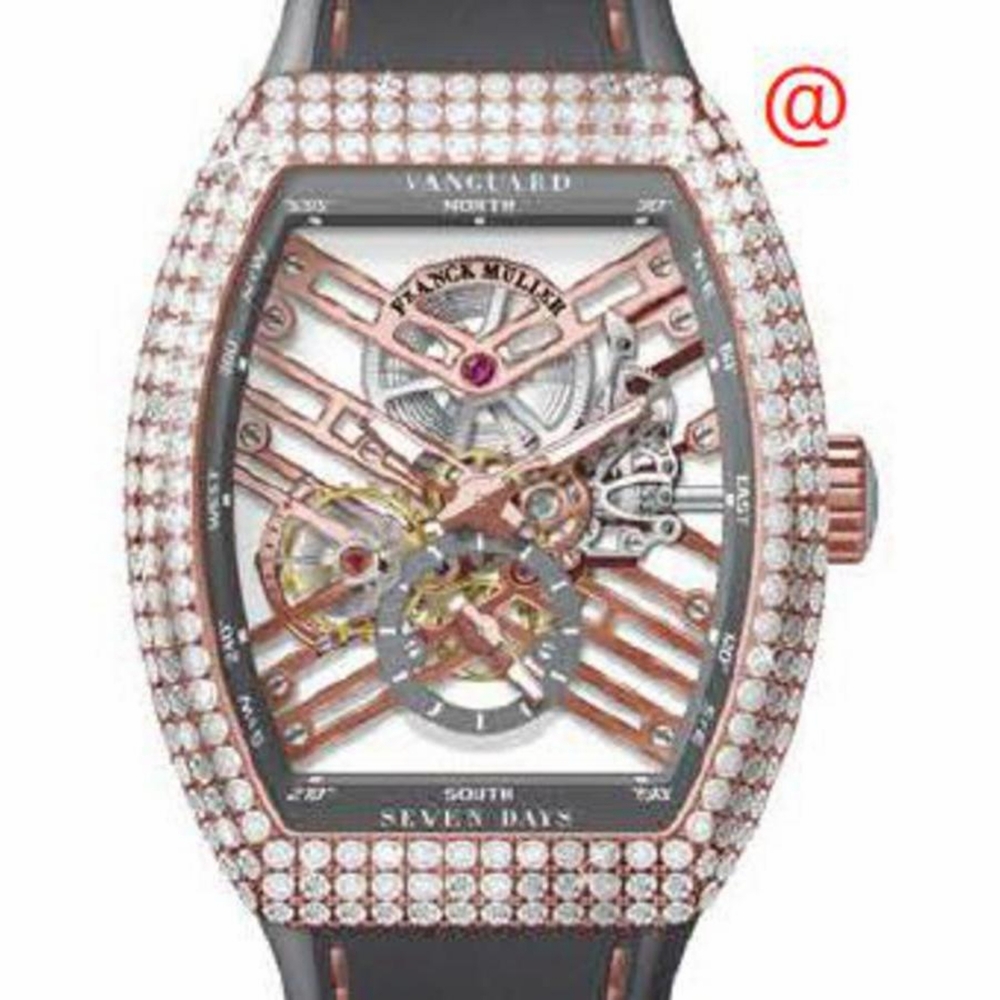 Rose gold-tone 18kt rose gold case with a grey alligator band. Fixed rose gold-tone bezel with diamond set 18kt rose gold. Transparent dial with rose gold-tone hands and index hour markers. Dial Type: Analog. Luminescent hands and markers. Hand wind movement. Scratch resistant sapphire crystal. Transparent see through case back. Tonneau case shape, case size: 45 mm. Functions: hour, minute, second. Additional Info: original box, international warranty card, manual (complete accessories). Seven Days Series. Luxury watch style. Watch label: Swiss Made. Franck Muller Seven Days Hand Wind Diamond Mens Watch V45S6SQTD5NTT(TTBLC).