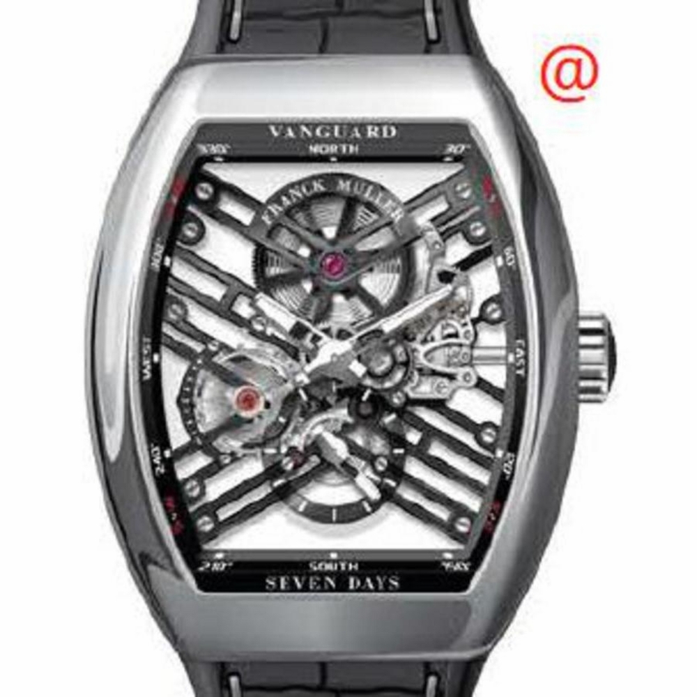 Silver-tone stainless steel case with a black alligator band. Fixed silver-tone stainless steel bezel. Transparent dial with silver-tone hands and index hour markers. Dial Type: Analog. Luminescent hands and markers. Hand wind movement. Scratch resistant sapphire crystal. Transparent see through case back. Tonneau case shape, case size: 45 mm. Functions: hour, minute, second. Additional Info: original box, international warranty card, manual (complete accessories). Seven Days Series. Luxury watch style. Watch label: Swiss Made. Franck Muller Seven Days Hand Wind Mens Watch V45S6SQTMVTNRACNR(NRBLCRGE).