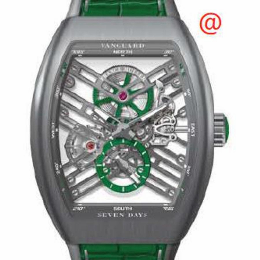Black titanium case with a green leather strap. Fixed black titanium bezel. Transparent dial with black hands and index hour markers. Dial Type: Analog. Luminescent hands and markers. Hand wind movement. Scratch resistant sapphire crystal. Transparent see through case back. Tonneau case shape, case size: 45 mm. Functions: hour, minute, second. Additional Info: original box, international warranty card, manual (complete accessories). Seven Days Series. Luxury watch style. Watch label: Swiss Made. Franck Muller Seven Days Hand Wind Mens Watch V45S6SQTTTBRVE(TTBLCVE).