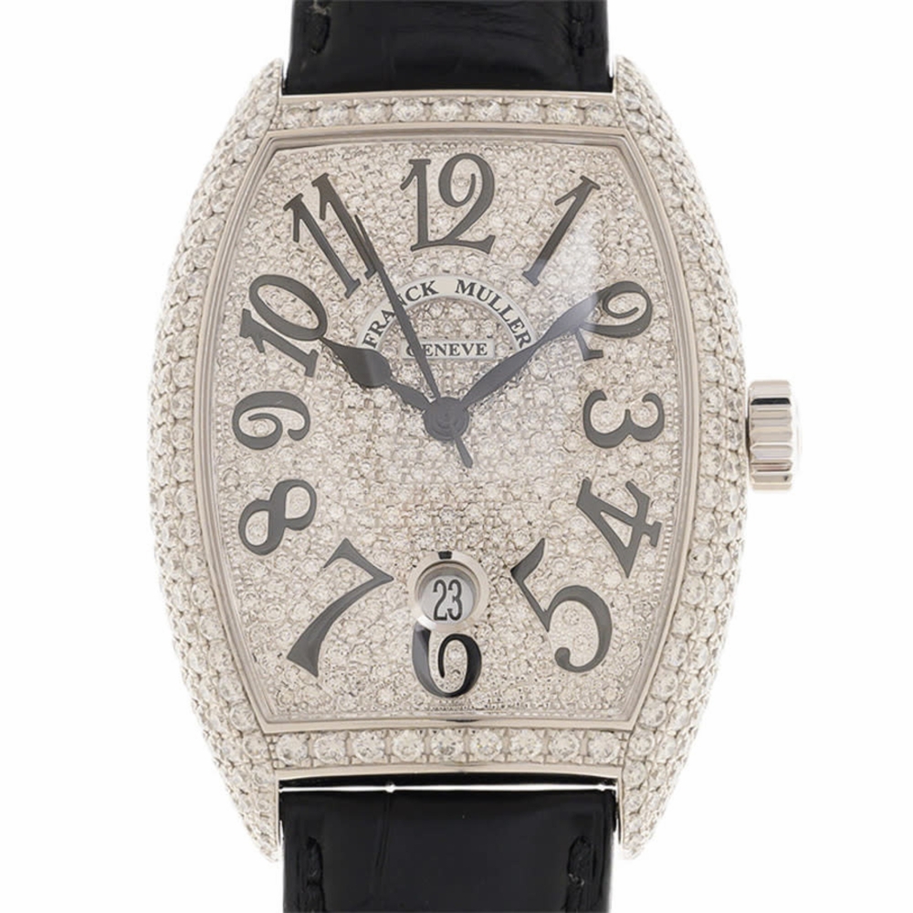18kt white gold case with a black leather strap. Fixed bezel with diamond set 18kt white gold. Silver-tone dial with black hands and Arabic numeral hour markers. Dial Type: Analog. Date display at the 6 o'clock position. Automatic movement. Scratch resistant sapphire crystal. Tonneau case shape, case size: 39 mm. Functions: date, hour, minute, second. Additional Info: original box, international warranty card, manual (complete accessories). Casablanca Series. Luxury watch style. Watch label: Swiss Made. Franck Muller Casablanca Automatic Diamond Silver Dial Mens Watch 7880SCDTD6CD(OG).