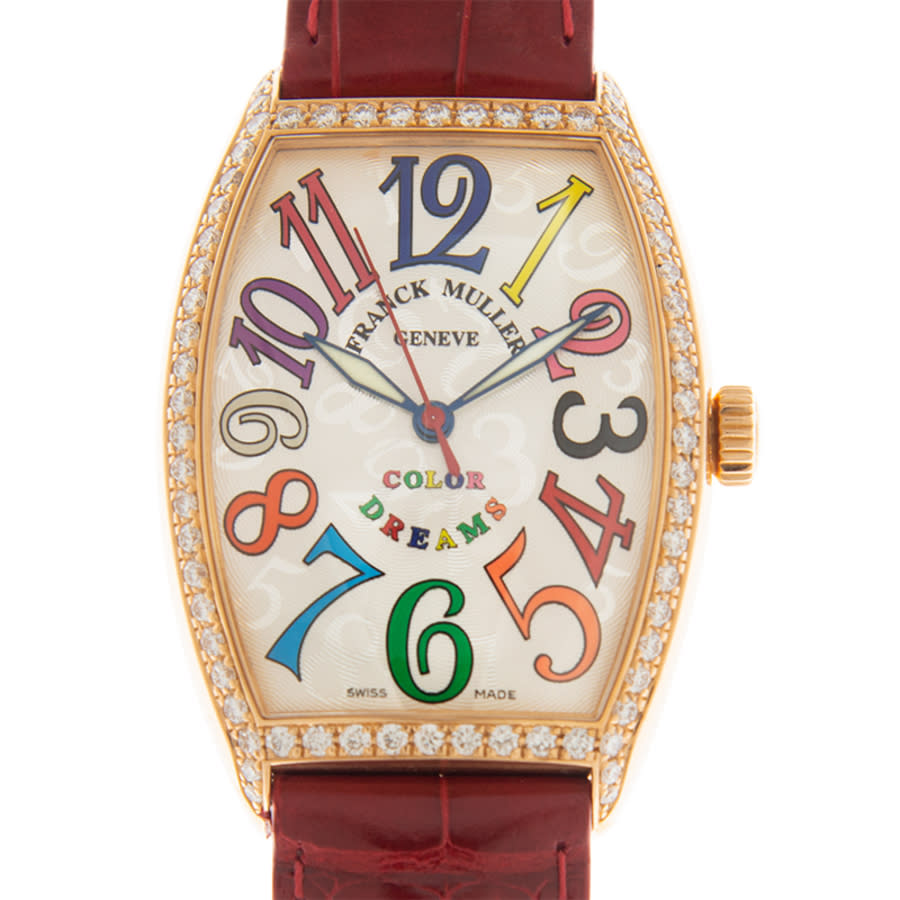 Rose gold-tone 18kt rose gold case with a red leather strap. Fixed rose gold-tone bezel with diamond set 18kt rose gold. Silver-tone dial with blue hands and Arabic numeral hour markers. Dial Type: Analog. Luminescent hands. Automatic movement. Scratch resistant sapphire crystal. Screw down crown. Solid case back. Tonneau case shape, case size: 32 mm. Buckle clasp. Functions: hour, minute, second. Additional Info: original box, international warranty card, manual (complete accessories). Cintree Curvex Series. Luxury watch style. Watch label: Swiss Made. Franck Muller Cintree Curvex Automatic Diamond Silver Dial Unisex Watch 5851MSCCOLDRMD1R(5N)-RED.