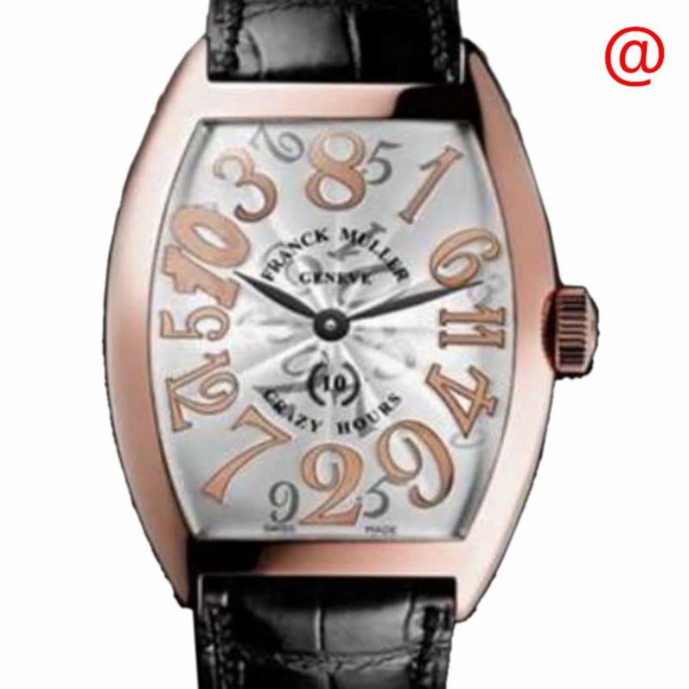 Rose gold-tone 18kt rose gold case with a black leather strap. Fixed rose gold-tone 18kt rose gold bezel. Silver-tone dial with black hands and Arabic numeral hour markers. Dial Type: Analog. Automatic movement. Scratch resistant sapphire crystal. Tonneau case shape, case size: 32 mm. Functions: hour, minute. Additional Info: original box, international warranty card, manual (complete accessories). Cintree Curvex Crazy Hours Series. Luxury watch style. Watch label: Swiss Made. Franck Muller Cintree Curvex Crazy Hours Automatic Silver Dial Unisex Watch 7851CHBLREL(5N).