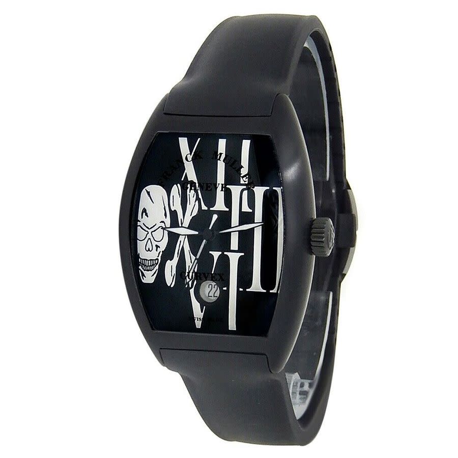 Black stainless steel case with a black rubber strap. Fixed black stainless steel bezel. Black dial with black hands and Roman numeral hour markers. Dial Type: Analog. Luminescent hands. Automatic movement. Scratch resistant sapphire crystal. Screw down crown. Solid case back. Tonneau case shape, case size: 40 mm. Deployment with push button release clasp. Functions: hour, minute, second. Cintree Curvex Series. Casual watch style. Watch label: Swiss Made. Franck Muller Cintree Curvex Automatic Black Dial Mens Watch 7880 SC DT GOTH NR.