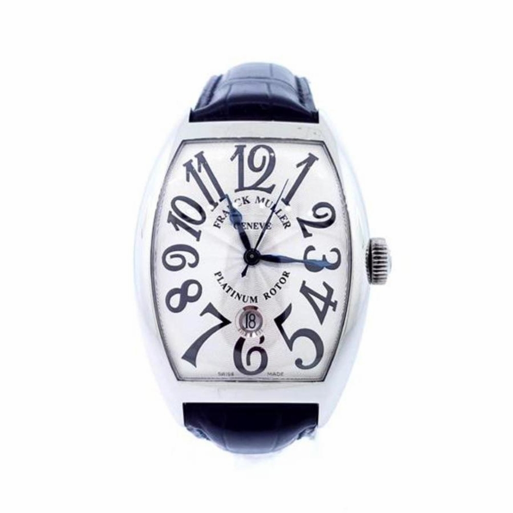 Silver-tone stainless steel case with a black alligator band. Fixed silver-tone stainless steel bezel. White dial with Arabic numeral hour markers. Dial Type: Analog. Automatic movement. Scratch resistant sapphire crystal. Pull / push crown. Solid case back. Tonneau case shape, case size: 39.5 mm. Band width: 22 mm, band length: 9 inches. Buckle clasp. Water resistant at 30 meters / 100 feet. Functions: date, hour, minute, second, water resistant. Cintree Curvex Series. Luxury watch style. Watch label: SWISS MADE. Franck Muller CINTREE CURVEX White Dial Mens Watch 8880 B SC DT ACE.