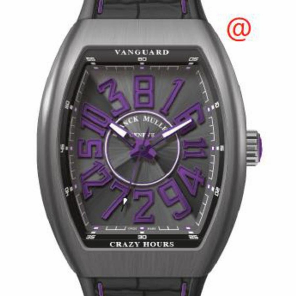 Grey titanium case with a black alligator band. Fixed grey titanium bezel. Black dial with purple hands and Arabic numeral hour markers. Minute markers around the outer rim. Dial Type: Analog. Luminescent hands and markers. Automatic movement. Scratch resistant sapphire crystal. Tonneau case shape, case size: 41 mm. Functions: hour, minute, second. Additional Info: original box, international warranty card, manual (complete accessories). Crazy Hours Series. Luxury watch style. Watch label: Swiss Made. Franck Muller Crazy Hours Automatic Black Dial Mens Watch V41CHTTBRVL(ANTVLVL).