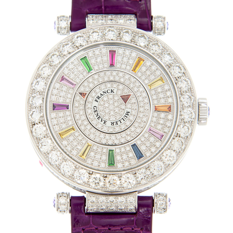 18kt white gold case with a white alligator band. Fixed 18kt white gold bezel with diamond set. Silver-tone dial with diamond hour markers. Dial Type: Analog. Automatic movement. Scratch resistant sapphire crystal. Screw down crown. Transparent see through case back. Round case shape, case size: 42 mm. Tang clasp. Water resistant at 30 meters / 100 feet. Functions: hour, minute. Double Mystery Series. Luxury watch style. Watch label: Swiss Made. Franck Muller Double Mystery Automatic Silver Dial Watch DM42COLDRMD1RCD(OG)-PUR STRAP.