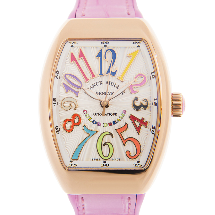 Gold-tone 18kt rose gold case with a pink alligator leather strap. Fixed gold-tone 18kt rose gold bezel. White dial with gold-tone leaf-style shape hands and multi-color Arabic numeral hour markers. Dial Type: Analog. Automatic movement. Scratch resistant sapphire crystal. Screw down crown. Solid case back. Tonneau case shape. Case size: 32 mm. Pin buckle clasp. Water resistant at 30 meters / 100 feet. Functions: hour, minute, second. Additional Info: original box, international warranty card, manual (complete accessories). Luxury watch style. Watch label: Swiss Made. Franck Muller Vanguard Color Dream Automatic White Dial Unisex Watch V 32 SC AT FO COL DRM (5N.RS).