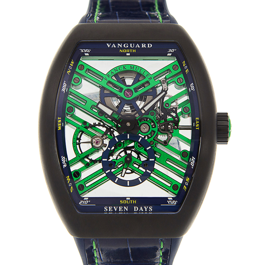 Black stainless steel case with a blue alligator leather strap. Fixed black stainless steel bezel. Skeleton dial with blue hands and index hour markers. Compass markers around the outer rim. Dial Type: Analog. Luminescent hands and markers. Automatic movement. Scratch resistant sapphire crystal. Transparent case back. Tonneau case shape. Case size: 44 mm. Deployment with push button release clasp. Functions: hour, minute, second. Additional Info: original box, international warranty card, manual (complete accessories). Luxury watch style. Watch label: Swiss Made. Franck Muller Vanguard Automatic Unisex Watch V 45 S6 SQT TT NR BR BL LE (AC).