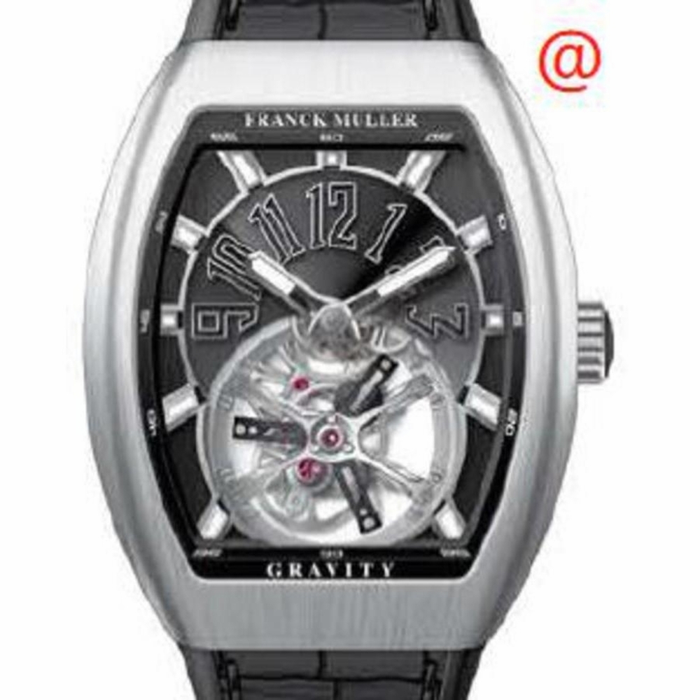 Silver-tone stainless steel case with a black alligator band. Fixed silver-tone stainless steel bezel. Black dial with silver-tone hands and Arabic numeral hour markers. Dial Type: Analog. Luminescent hands and markers. Hand wind movement. Scratch resistant sapphire crystal. Transparent see through case back. Tonneau case shape, case size: 41 mm. Functions: hour, minute, second. Additional Info: original box, international warranty card, manual (complete accessories). Gravity Series. Luxury watch style. Watch label: Swiss Made. Franck Muller Gravity Hand Wind Black Dial Mens Watch V41TGRAVITYCSACBRNR(NRNRACBR).