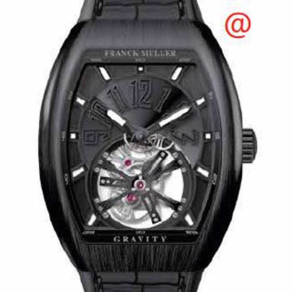 Black titanium case with a black alligator band. Fixed black titanium bezel. Black dial with black hands and Arabic numeral hour markers. Dial Type: Analog. Luminescent hands and markers. Hand wind movement. Scratch resistant sapphire crystal. Transparent see through case back. Tonneau case shape, case size: 41 mm. Functions: hour, minute, second. Additional Info: original box, international warranty card, manual (complete accessories). Gravity Series. Luxury watch style. Watch label: Swiss Made. Franck Muller Gravity Hand Wind Black Dial Mens Watch V41TGRAVITYCSTTNRBRNR(NRNRNR).