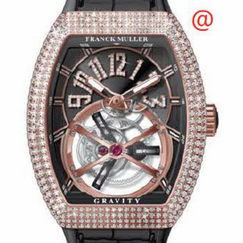 Rose gold-tone 18kt rose gold case with a black leather strap. Fixed rose gold-tone bezel with diamond set 18kt rose gold. Black dial with rose gold-tone hands and Arabic numeral hour markers. Dial Type: Analog. Luminescent hands and markers. Hand wind movement. Scratch resistant sapphire crystal. Transparent see through case back. Tonneau case shape, case size: 44 mm. Functions: hour, minute, second. Additional Info: original box, international warranty card, manual (complete accessories). Gravity Series. Luxury watch style. Watch label: Swiss Made. Franck Muller Gravity Hand Wind Diamond Black Dial Mens Watch V45TGRAVITYCSDNBRCD5NNR(NRDIAM5N).