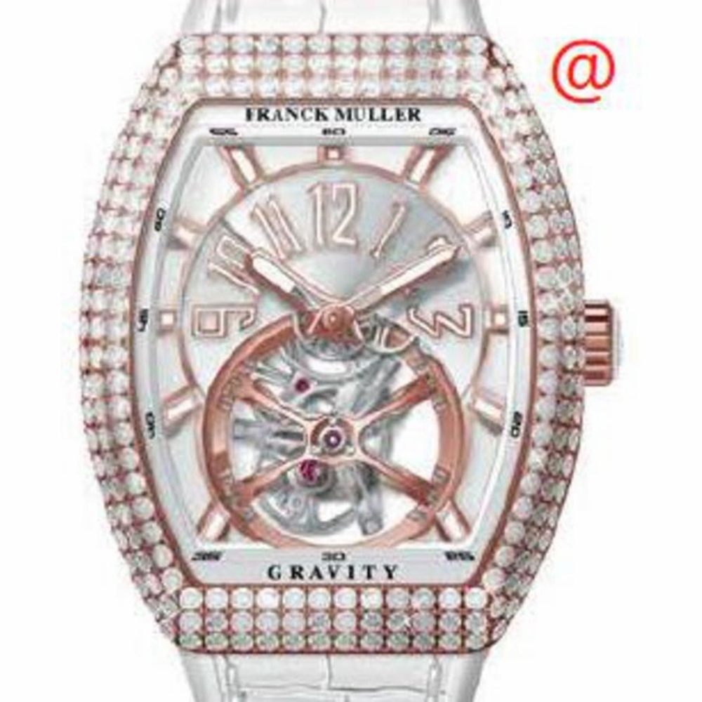 Rose gold-tone 18kt rose gold case with a white alligator band. Fixed rose gold-tone bezel with diamond set 18kt rose gold. Silver-tone dial with rose gold-tone hands and Arabic numeral hour markers. Dial Type: Analog. Luminescent hands and markers. Hand wind movement. Scratch resistant sapphire crystal. Transparent see through case back. Tonneau case shape, case size: 41 mm. Functions: hour, minute, second. Additional Info: original box, international warranty card, manual (complete accessories). Gravity Series. Luxury watch style. Watch label: Swiss Made. Franck Muller Gravity Hand Wind Diamond Silver Dial Mens Watch V41TGRAVITYCSD5NBC(BLCBLC5N).
