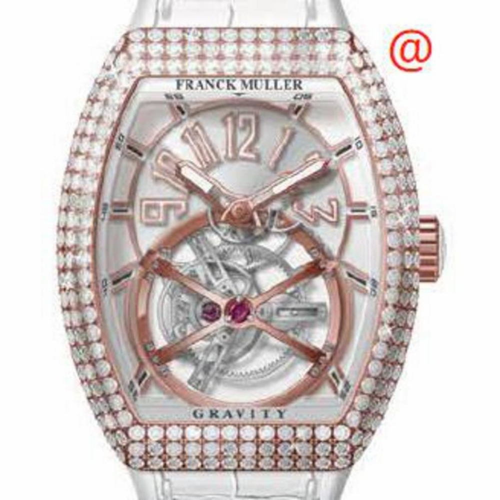 Rose gold-tone 18kt rose gold case with a white leather strap. Fixed rose gold-tone bezel with diamond set 18kt rose gold. Silver-tone dial with rose gold-tone hands and Arabic numeral hour markers. Dial Type: Analog. Luminescent hands and markers. Hand wind movement. Scratch resistant sapphire crystal. Transparent see through case back. Tonneau case shape, case size: 44 mm. Functions: hour, minute, second. Additional Info: original box, international warranty card, manual (complete accessories). Gravity Series. Luxury watch style. Watch label: Swiss Made. Franck Muller Gravity Hand Wind Diamond Silver Dial Mens Watch V45TGRAVITYCSD5NBC(BLCBLC5N).