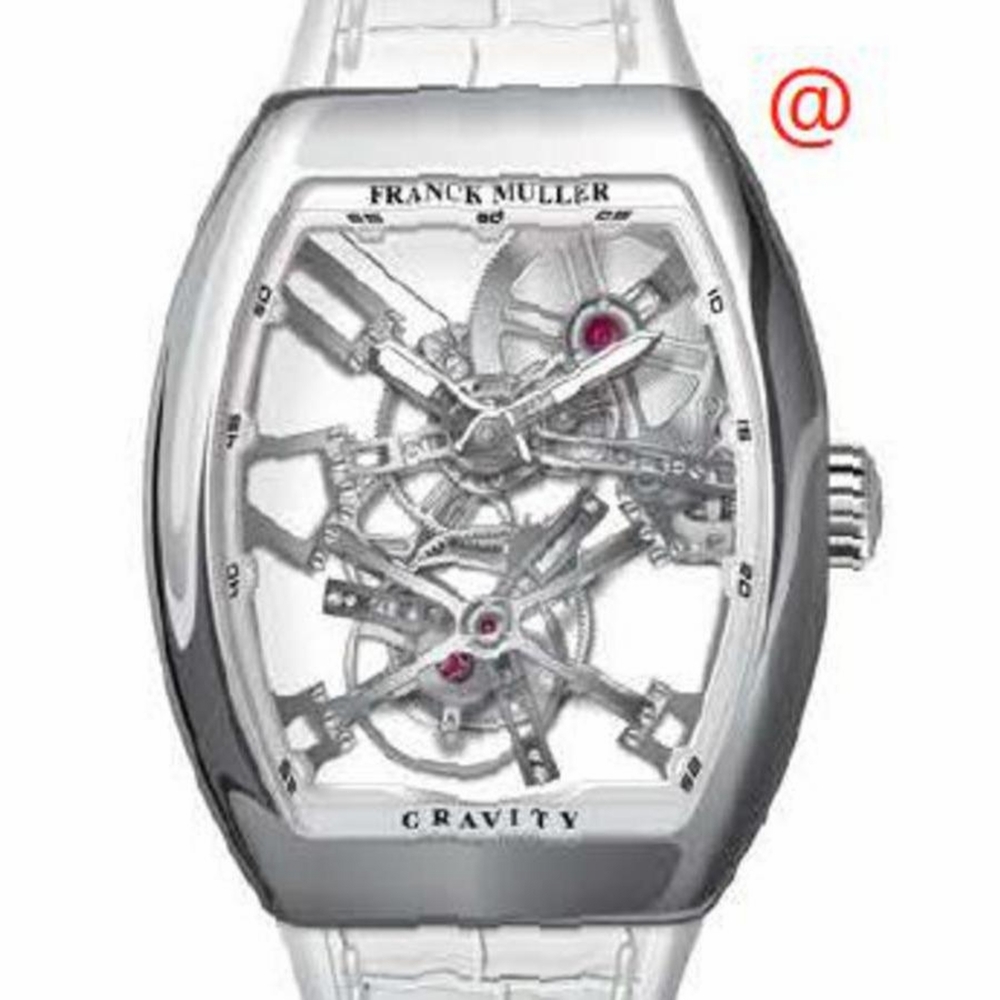 Silver-tone stainless steel case with a white leather strap. Fixed silver-tone stainless steel bezel. Transparent dial with silver-tone hands and Arabic numeral hour markers. Dial Type: Analog. Luminescent hands and markers. Hand wind movement. Scratch resistant sapphire crystal. Transparent see through case back. Tonneau case shape, case size: 44 mm. Functions: hour, minute, second. Additional Info: original box, international warranty card, manual (complete accessories). Gravity Series. Luxury watch style. Watch label: Swiss Made. Franck Muller Gravity Hand Wind Mens Watch V45TGRAVITYCSSQT(ACBC).