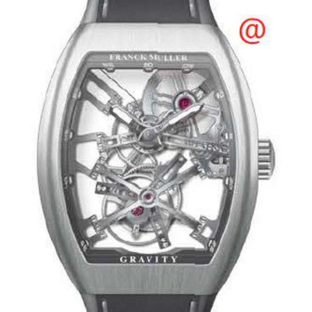Silver-tone stainless steel case with a black leather strap. Fixed silver-tone stainless steel bezel. Transparent dial with silver-tone hands and Arabic numeral hour markers. Dial Type: Analog. Luminescent hands and markers. Hand wind movement. Scratch resistant sapphire crystal. Transparent see through case back. Tonneau case shape, case size: 44 mm. Functions: hour, minute, second. Additional Info: original box, international warranty card, manual (complete accessories). Gravity Series. Luxury watch style. Watch label: Swiss Made. Franck Muller Gravity Hand Wind Mens Watch V45TGRAVITYCSSQT(ACBRTT).