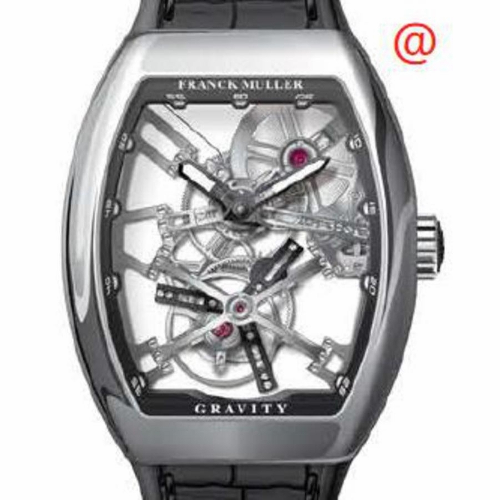 Silver-tone stainless steel case with a black leather strap. Fixed silver-tone stainless steel bezel. Transparent dial with black hands and Arabic numeral hour markers. Dial Type: Analog. Luminescent hands and markers. Hand wind movement. Scratch resistant sapphire crystal. Transparent see through case back. Tonneau case shape, case size: 44 mm. Functions: hour, minute, second. Additional Info: original box, international warranty card, manual (complete accessories). Gravity Series. Luxury watch style. Watch label: Swiss Made. Franck Muller Gravity Hand Wind Mens Watch V45TGRAVITYCSSQT(ACNR).
