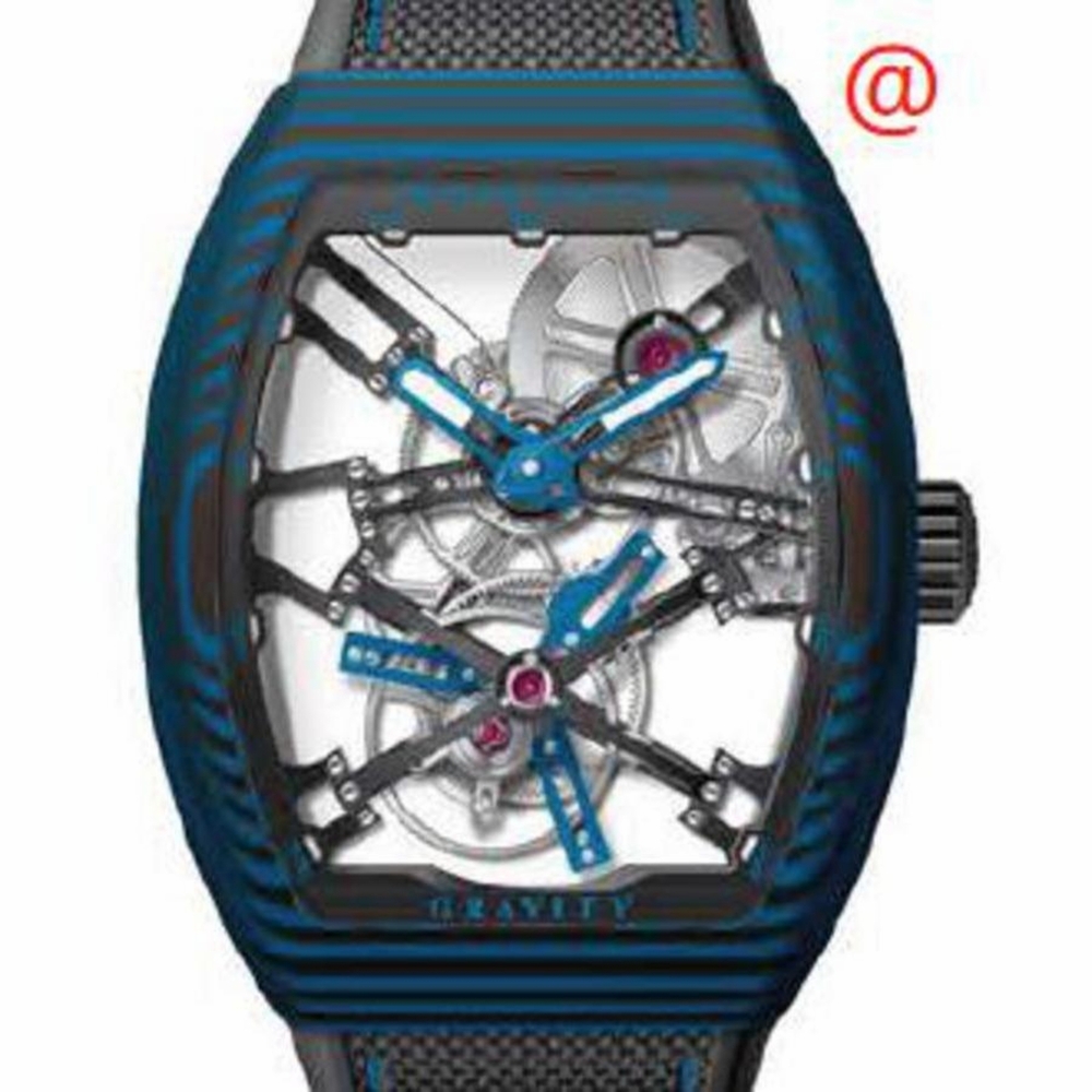 Blue polycarbonate case with a black leather strap. Fixed blue polycarbonate bezel. Transparent dial with blue hands and Arabic numeral hour markers. Dial Type: Analog. Luminescent hands and markers. Hand wind movement. Scratch resistant sapphire crystal. Transparent see through case back. Tonneau case shape, case size: 44 mm. Functions: hour, minute, second. Additional Info: original box, international warranty card, manual (complete accessories). Gravity Series. Luxury watch style. Watch label: Swiss Made. Franck Muller Gravity Hand Wind Mens Watch V45TGRAVITYCSSQT(CARBLNR).