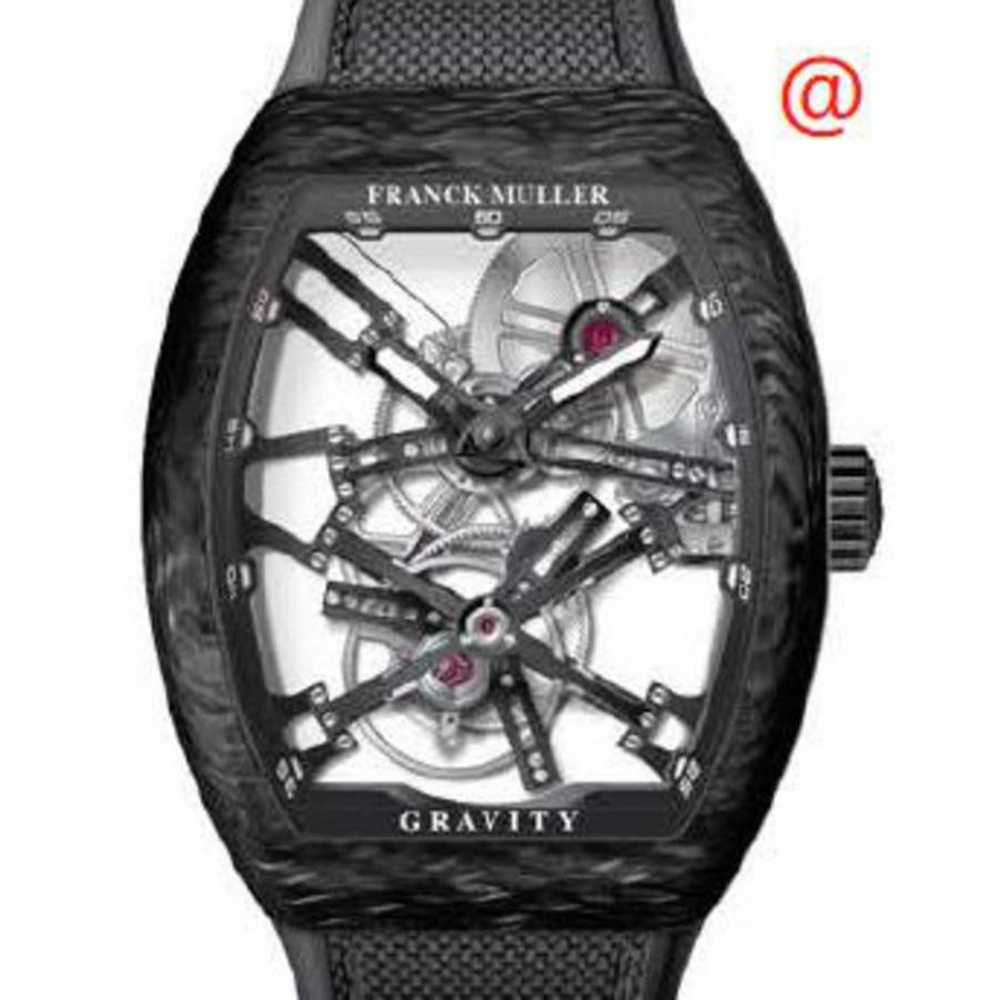 Black polycarbonate case with a black leather strap. Fixed black polycarbonate bezel. Transparent dial with black hands and Arabic numeral hour markers. Dial Type: Analog. Luminescent hands and markers. Hand wind movement. Scratch resistant sapphire crystal. Transparent see through case back. Tonneau case shape, case size: 44 mm. Functions: hour, minute, second. Additional Info: original box, international warranty card, manual (complete accessories). Gravity Series. Luxury watch style. Watch label: Swiss Made. Franck Muller Gravity Hand Wind Mens Watch V45TGRAVITYCSSQT(CARBONNR).