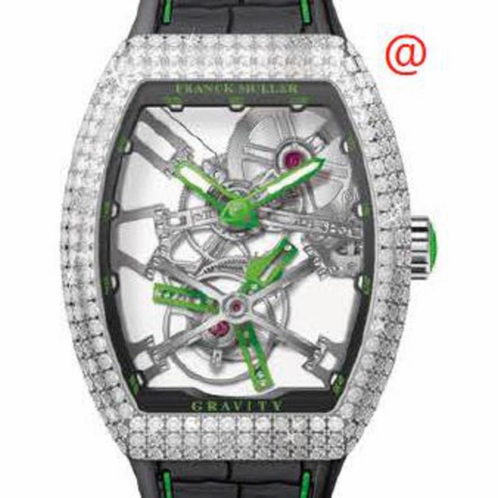 Silver-tone stainless steel case with a black leather strap. Fixed silver-tone bezel with diamond set stainless steel. Transparent dial with green hands and Arabic numeral hour markers. Dial Type: Analog. Luminescent hands and markers. Hand wind movement. Scratch resistant sapphire crystal. Transparent see through case back. Tonneau case shape, case size: 44 mm. Functions: hour, minute, second. Additional Info: original box, international warranty card, manual (complete accessories). Gravity Series. Luxury watch style. Watch label: Swiss Made. Franck Muller Gravity Hand Wind Diamond Mens Watch V45TGRAVITYCSSQTD(ACVE).