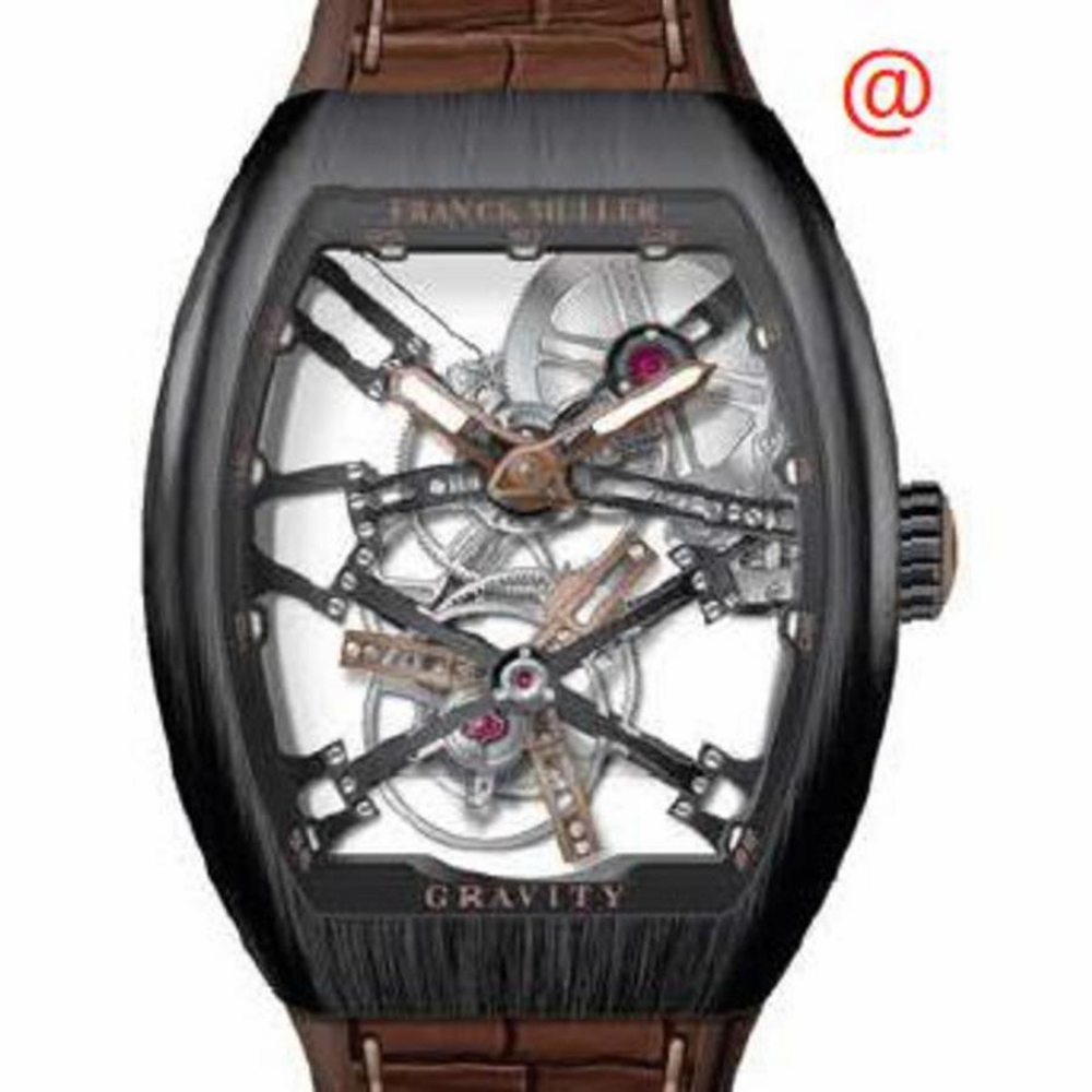 Black titanium case with a brown leather strap. Fixed black titanium bezel. Transparent dial with brown hands and Arabic numeral hour markers. Dial Type: Analog. Luminescent hands and markers. Hand wind movement. Scratch resistant sapphire crystal. Transparent see through case back. Tonneau case shape, case size: 44 mm. Functions: hour, minute, second. Additional Info: original box, international warranty card, manual (complete accessories). Gravity Series. Luxury watch style. Watch label: Swiss Made. Franck Muller Gravity Hand Wind Mens Watch V45TGRAVITYCSSQT(TTNRBRBZ).