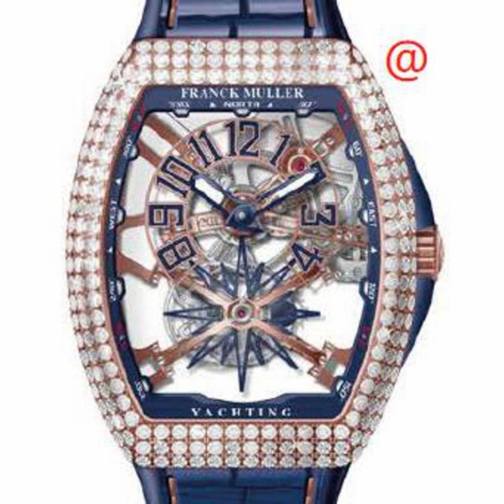 Rose gold-tone 18kt rose gold case with a blue alligator band. Fixed rose gold-tone bezel with diamond set 18kt rose gold. Transparent dial with blue hands and Arabic numeral hour markers. Dial Type: Analog. Luminescent hands and markers. Hand wind movement. Scratch resistant sapphire crystal. Transparent see through case back. Tonneau case shape, case size: 45 mm. Functions: hour, minute, second. Additional Info: original box, international warranty card, manual (complete accessories). Vanguard Yachting Tourbillon Series. Luxury watch style. Watch label: Swiss Made. Franck Muller Vanguard Yachting Tourbillon Hand Wind Diamond Mens Watch V45TGRCSSQTDNBRYACHTING5NBL(BLBLCRGE).