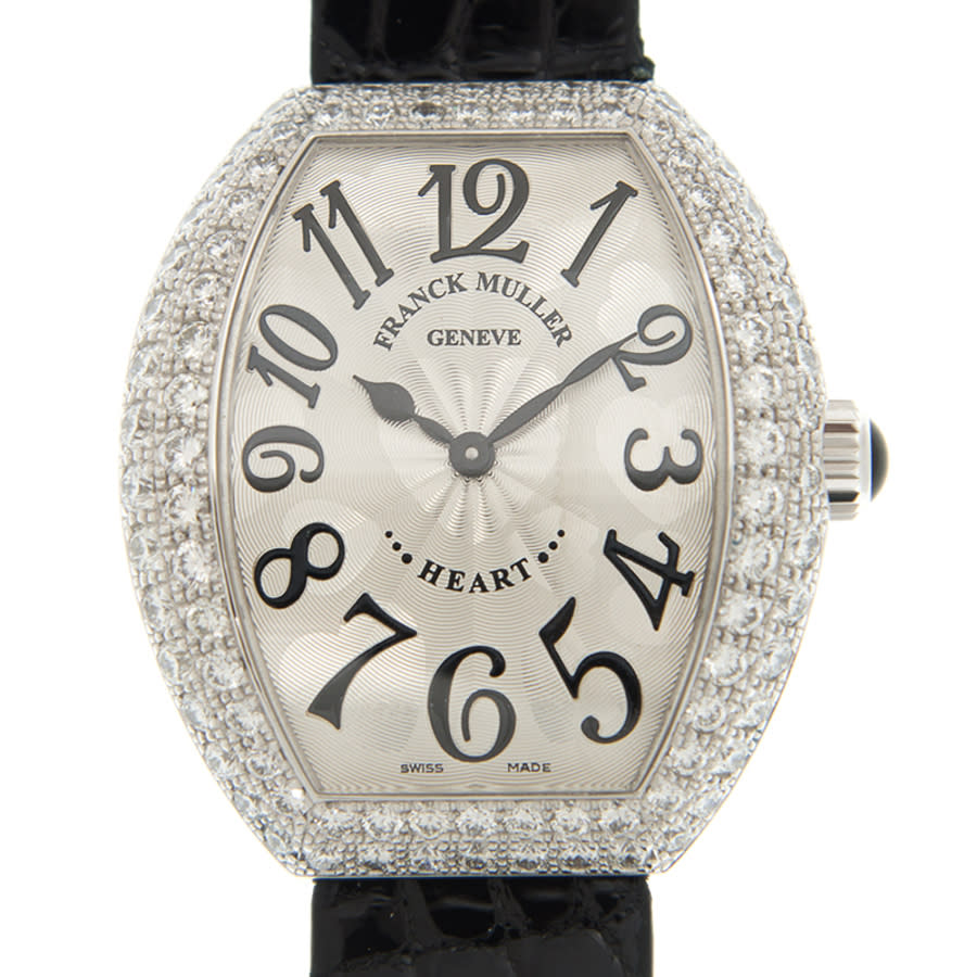 18kt white gold case with a black leather strap. Fixed 18kt white gold diamond set bezel. White dial with black spade-shaped hands and Arabic numeral hour markers. Dial Type: Analog. Quartz movement. Scratch resistant sapphire crystal. Screw down crown. Solid case back. Tonneau case shape. Case size: 35 mm. Pin buckle clasp. Water resistant at 30 meters / 100 feet. Functions: hour, minute. Additional Info: original box, international warranty card, manual (complete accessories). Luxury watch style. Watch label: Swiss Made. Franck Muller Heart Quartz Diamond White Dial Ladies Watch 5002MQZD2(OG).