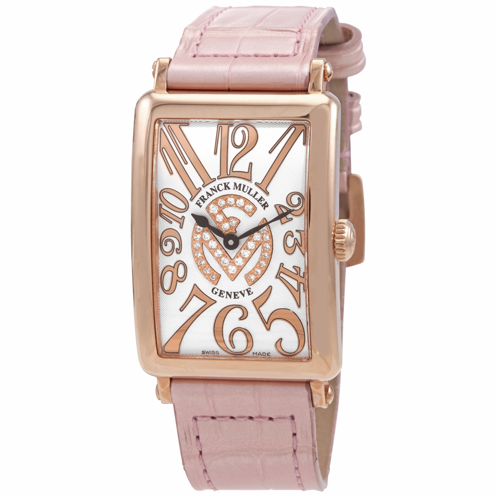 18kt rose gold case with a pink leather strap. Fixed bezel. White dial with Arabic numeral hour markers. Dial Type: Analog. Quartz movement. Scratch resistant sapphire crystal. Solid case back. Rectangle case shape, case size: 45 mm x 26 mm. Tang clasp. Water resistant at 30 meters / 100 feet. Functions: hour, minute. Long Island Series. Luxury watch style. Watch label: Swiss Made. Franck Muller Long Island 18kt Rose Gold Quartz White Dial Ladies Watch 952 QZ CD 1R REL FM LTD.