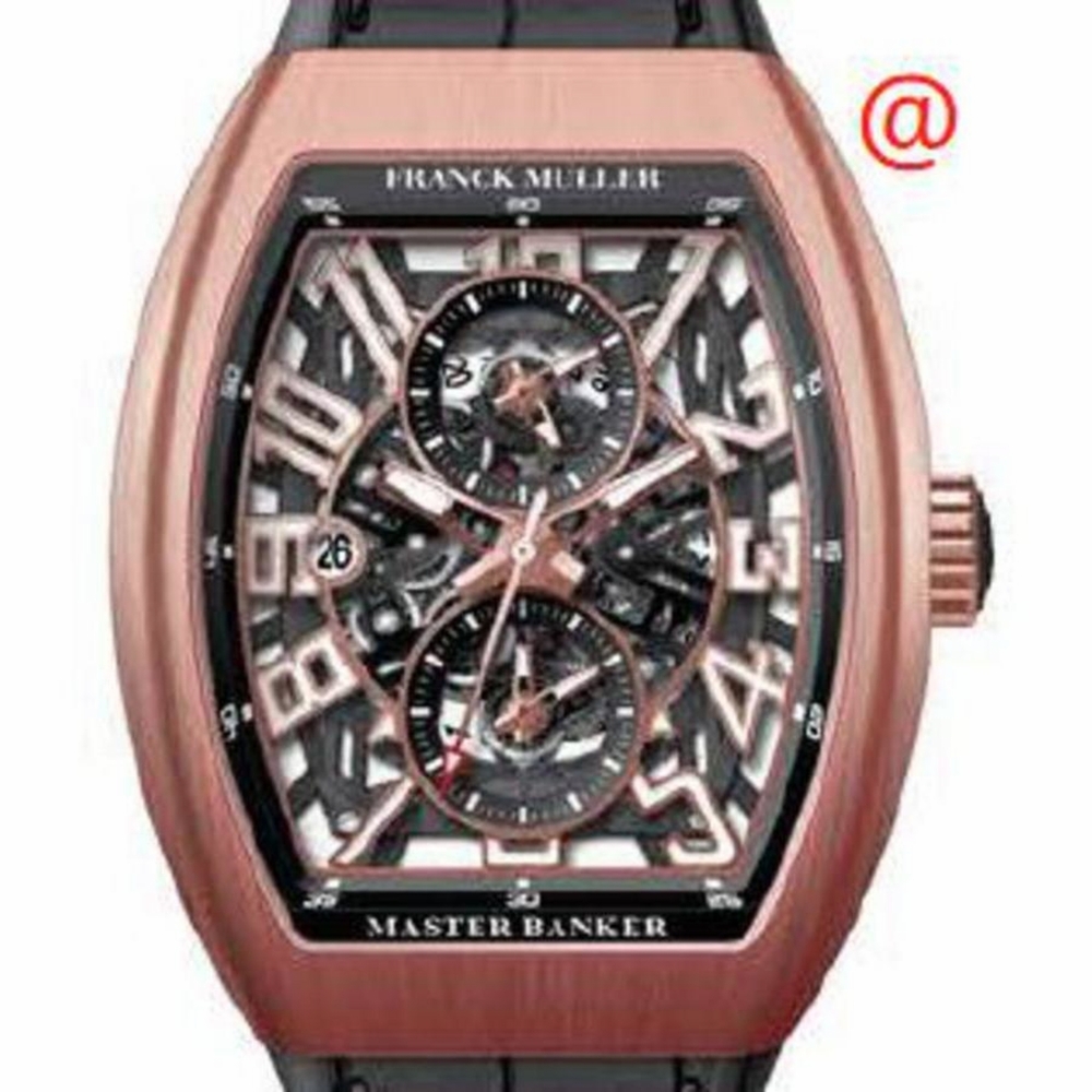 Rose gold-tone 18kt rose gold case with a black leather strap. Fixed rose gold-tone 18kt rose gold bezel. Transparent dial with rose gold-tone hands and Arabic numeral hour markers. Minute markers around the outer rim. Dial Type: Analog. Luminescent hands and markers. Date display at the 9 o'clock position. Chronograph - two sub-dials displaying: 60 second and 30 minute. Automatic movement. Scratch resistant sapphire crystal. Transparent see through case back. Tonneau case shape, case size: 45 mm. Functions: chronograph, date, hour, minute, second. Additional Info: original box, international warranty card, manual (complete accessories). Master Banker Skeleton Series. Luxury watch style. Watch label: Swiss Made. Franck Muller Master Banker Skeleton Chronograph Automatic Mens Watch V45MBSCDTSQT5NBRNR(NRBLC5NBR).