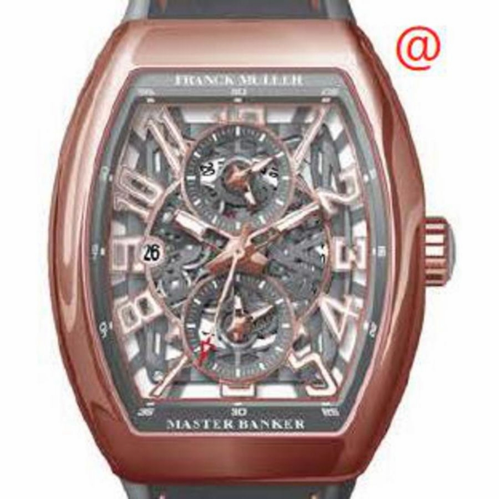 Rose gold-tone 18kt rose gold case with a grey leather strap. Fixed rose gold-tone 18kt rose gold bezel. Transparent dial with rose gold-tone hands and Arabic numeral hour markers. Dial Type: Analog. Luminescent hands and markers. Date display at the 9 o'clock position. Chronograph - two sub-dials displaying: 60 second and 30 minute. Automatic movement. Scratch resistant sapphire crystal. Transparent see through case back. Tonneau case shape, case size: 45 mm. Functions: chronograph, date, hour, minute, second. Additional Info: original box, international warranty card, manual (complete accessories). Master Banker Skeleton Series. Luxury watch style. Watch label: Swiss Made. Franck Muller Master Banker Skeleton Chronograph Automatic Mens Watch V45MBSCDTSQT5NTT(TTBLC5N).