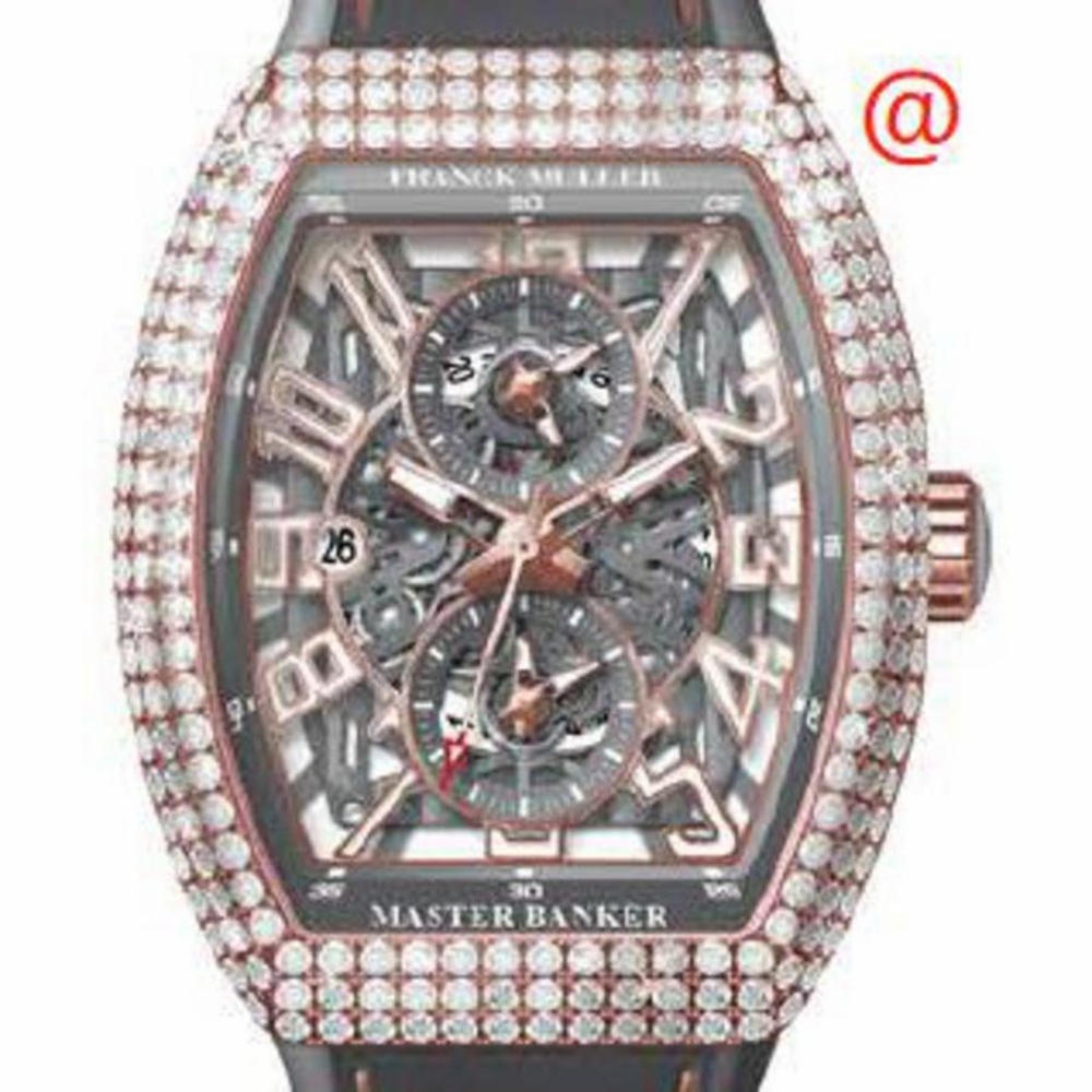 Rose gold-tone 18kt rose gold case with a grey leather strap. Fixed rose gold-tone bezel with diamond set 18kt rose gold. Transparent dial with rose gold-tone hands and Arabic numeral hour markers. Dial Type: Analog. Luminescent hands and markers. Date display at the 9 o'clock position. Chronograph - two sub-dials displaying: 60 second and 30 minute. Automatic movement. Scratch resistant sapphire crystal. Transparent see through case back. Tonneau case shape, case size: 45 mm. Functions: chronograph, date, hour, minute, second. Additional Info: original box, international warranty card, manual (complete accessories). Master Banker Skeleton Series. Luxury watch style. Watch label: Swiss Made. Franck Muller Master Banker Skeleton Chronograph Automatic Diamond Mens Watch V45MBSCDTSQTD5NTT(TTBLC5N).