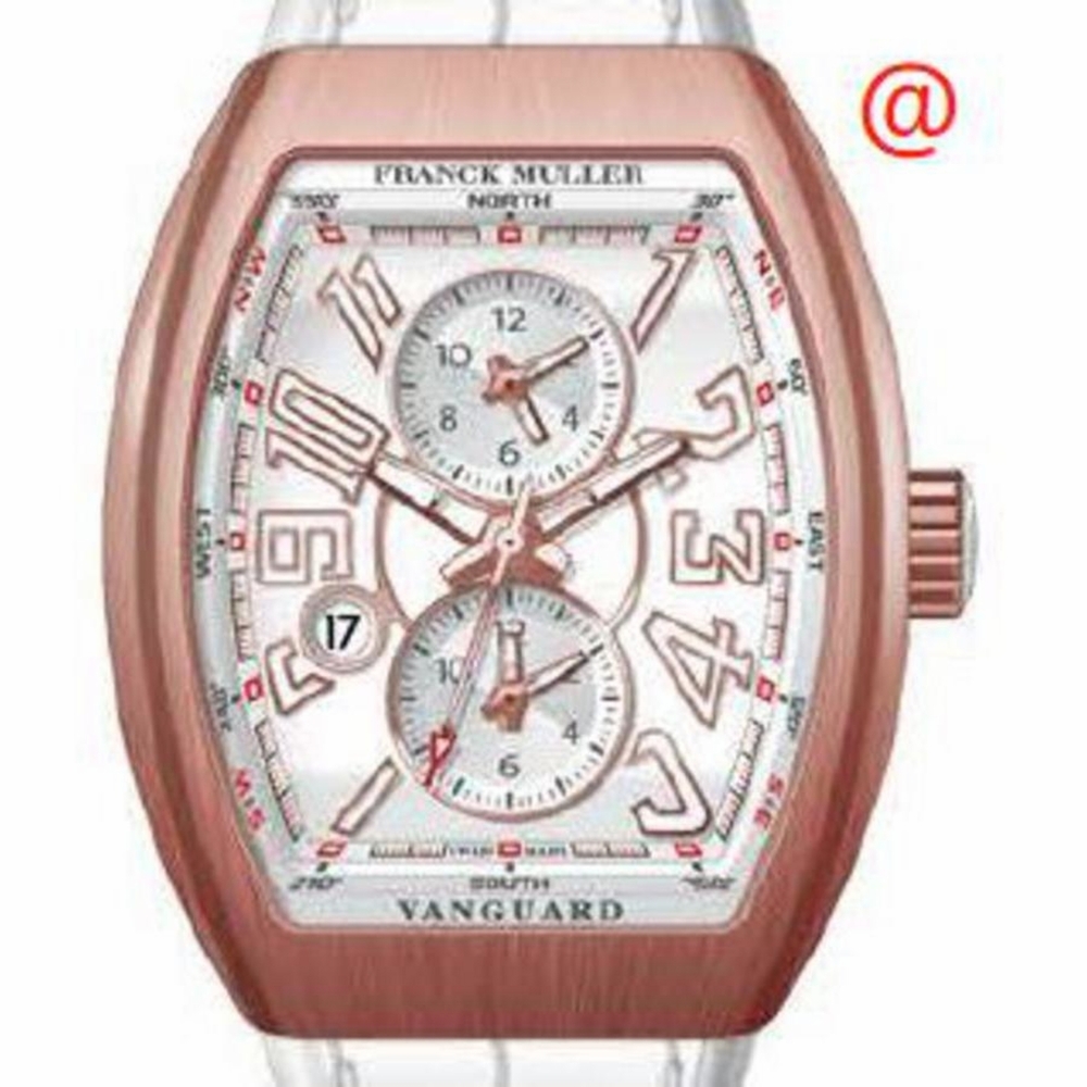 Rose gold-tone 18kt rose gold case with a white alligator band. Fixed rose gold-tone 18kt rose gold bezel. White dial with rose gold-tone hands and Arabic numeral hour markers. Minute markers around the outer rim. Dial Type: Analog. Luminescent hands and markers. Date display at the 8 o'clock position. Automatic movement. Scratch resistant sapphire crystal. Tonneau case shape, case size: 45 mm. Functions: chronograph, date, hour, minute, second. Additional Info: original box, international warranty card, manual (complete accessories). Master Banker Series. Luxury watch style. Watch label: Swiss Made. Franck Muller Master Banker Chronograph Automatic White Dial Mens Watch V45MBSCDT5NBRBC(BLCBLC5NBR).