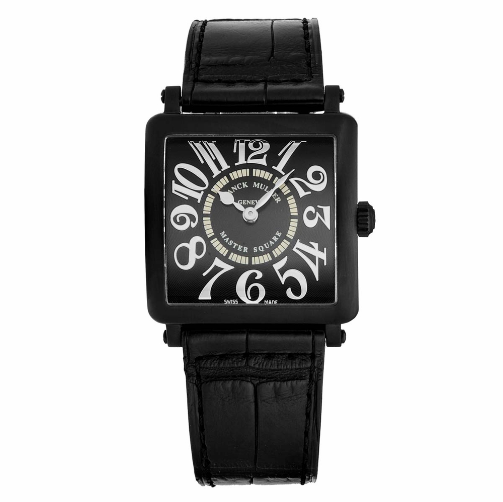 Black PVD steel case with a black leather strap. Fixed black PVD steel bezel. Black dial with silvertone hands and Arabic numerals hour markers. Dial Type: Analog. Quartz movement. Scratch resistant sapphire crystal. Pull / push crown. Stainless steel case back. Square case shape, case size: 30 mm, case thickness: 8.3 mm. Band width: 20 mm, band length: 7 inches. Buckle clasp. Water resistant at 3 atm/30 meters/100 feet. Functions: hour, minute. Master Square Series. Watch label: Swiss Made. Franck Muller Master Square Quartz Black Dial Ladies Watch 6002 LQZRLFRNRAC.