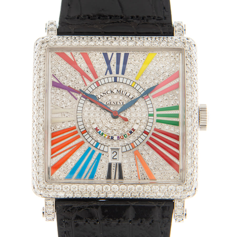 18kt white gold case with a black leather strap. Fixed bezel with diamond set 18kt white gold. Silver-tone dial with blue hands and Roman numeral hour markers. Minute scale around the inner rim. Dial Type: Analog. Date display at the 6 o'clock position. Automatic movement. Scratch resistant sapphire crystal. Screw down crown. Square case shape, case size: 42 mm. Buckle clasp. Functions: date, hour, minute, second. Additional Info: original box, international warranty card, manual (complete accessories). Master Square Series. Luxury watch style. Watch label: Swiss Made. Franck Muller Master Square Automatic Diamond Silver Dial Unisex Watch 6000KSCDTDCDCOLDRM(OG).