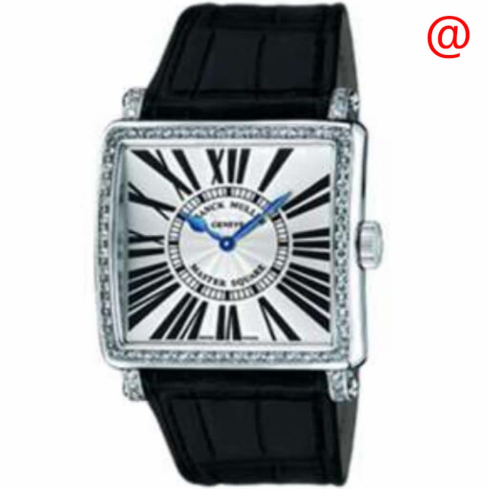 Silver-tone stainless steel case with a black leather strap. Fixed silver-tone bezel with diamond set stainless steel. Silver-tone dial with blue hands and Roman numeral hour markers. Minute scale around the inner rim. Dial Type: Analog. Quartz movement. Scratch resistant sapphire crystal. Square case shape, case size: 35 mm. Functions: hour, minute. Additional Info: original box, international warranty card, manual (complete accessories). Master Square Series. Luxury watch style. Watch label: Swiss Made. Franck Muller Master Square Quartz Diamond Silver Dial Ladies Watch 6002HQZD1RBLR(AC).