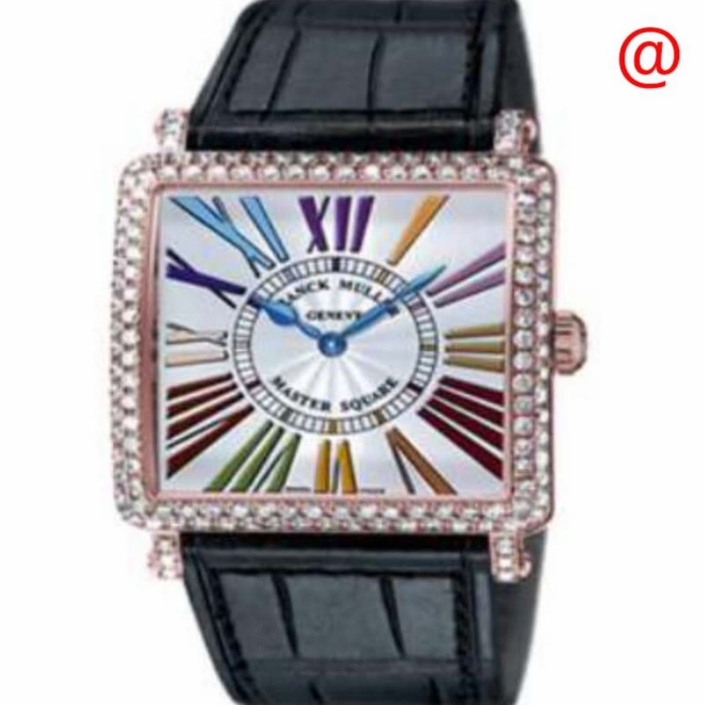 Rose gold-tone 18kt rose gold case with a blue leather strap. Fixed rose gold-tone bezel with diamond set 18kt rose gold. Silver-tone dial with blue hands and Roman numeral hour markers. Minute scale around the inner rim. Dial Type: Analog. Quartz movement. Scratch resistant sapphire crystal. Square case shape, case size: 32 mm. Functions: hour, minute. Additional Info: original box, international warranty card, manual (complete accessories). Master Square Series. Luxury watch style. Watch label: Swiss Made. Franck Muller Master Square Quartz Diamond Silver Dial Ladies Watch 6002MQZDCOLDRBL(5N).