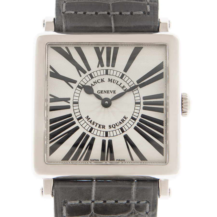 18kt white gold case with a grey alligator band. Fixed 18kt white gold bezel. Silver-tone dial with black hands and Roman numeral hour markers. Minute scale around the inner rim. Dial Type: Analog. Quartz movement. Scratch resistant sapphire crystal. Screw down crown. Solid case back. Square case shape, case size: 32 mm. Buckle clasp. Functions: hour, minute. Additional Info: original box, international warranty card, manual (complete accessories). Master Square Series. Luxury watch style. Watch label: Swiss Made. Franck Muller Master Square Quartz Silver Dial Unisex Watch 6002MQZR(OG)-GREY.