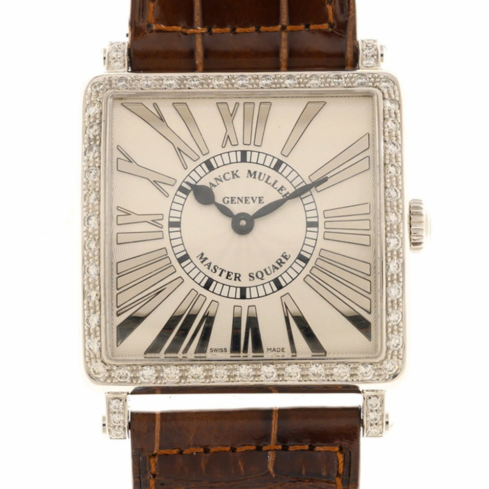 18kt white gold case with a brown leather strap. Fixed bezel with diamond set 18kt white gold. White dial with black hands and Roman numeral hour markers. Minute scale around the inner rim. Dial Type: Analog. Quartz movement. Scratch resistant sapphire crystal. Solid case back. Square case shape, case size: 32 mm. Buckle clasp. Functions: hour, minute. Additional Info: original box, international warranty card, manual (complete accessories). Master Square Series. Luxury watch style. Watch label: Swiss Made. Franck Muller Master Square Quartz Diamond White Dial Ladies Watch 6002MQZRELRD1R(OG)-BRSTRAP.