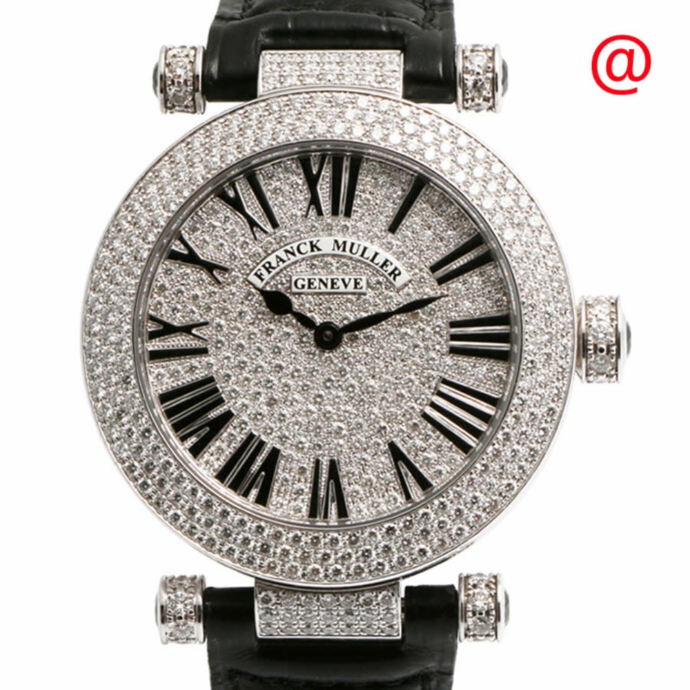 18kt white gold case with a black alligator band. Fixed bezel with diamond set 18kt white gold. Silver-tone dial with black hands and Roman numeral hour markers. Dial Type: Analog. Quartz movement. Scratch resistant sapphire crystal. Round case shape, case size: 39 mm. Functions: hour, minute. Additional Info: original box, international warranty card, manual (complete accessories). Round Series. Luxury watch style. Watch label: Swiss Made. Franck Muller Round Quartz Diamond Silver Dial Mens Watch 3900QZRD3CD(OG).