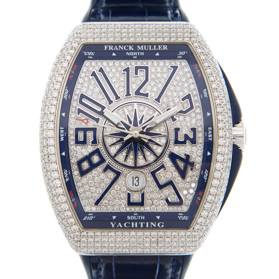 18kt white gold case with a blue leather strap. Fixed 18kt white gold with diamond bezel. Diamond pave dial with silver-tone hands and Arabic numeral hour markers. Compass markers around the outer rim. Dial Type: Analog. Luminescent hands and markers. Date display at the 6 o'clock position. Automatic movement. Scratch resistant sapphire crystal. Screw down crown. Solid case back. Tonneau case shape, case size: 44 x 54 mm. Buckle clasp. Functions: date, hour, minute. Additional Info: original box, international warranty card, manual (complete accessories). Vanguard series. Luxury watch style. Watch label: Swiss Made. Franck Muller Vanguard Automatic Diamond Mens Watch V45SCDTDCDYACHTING(OGBL).