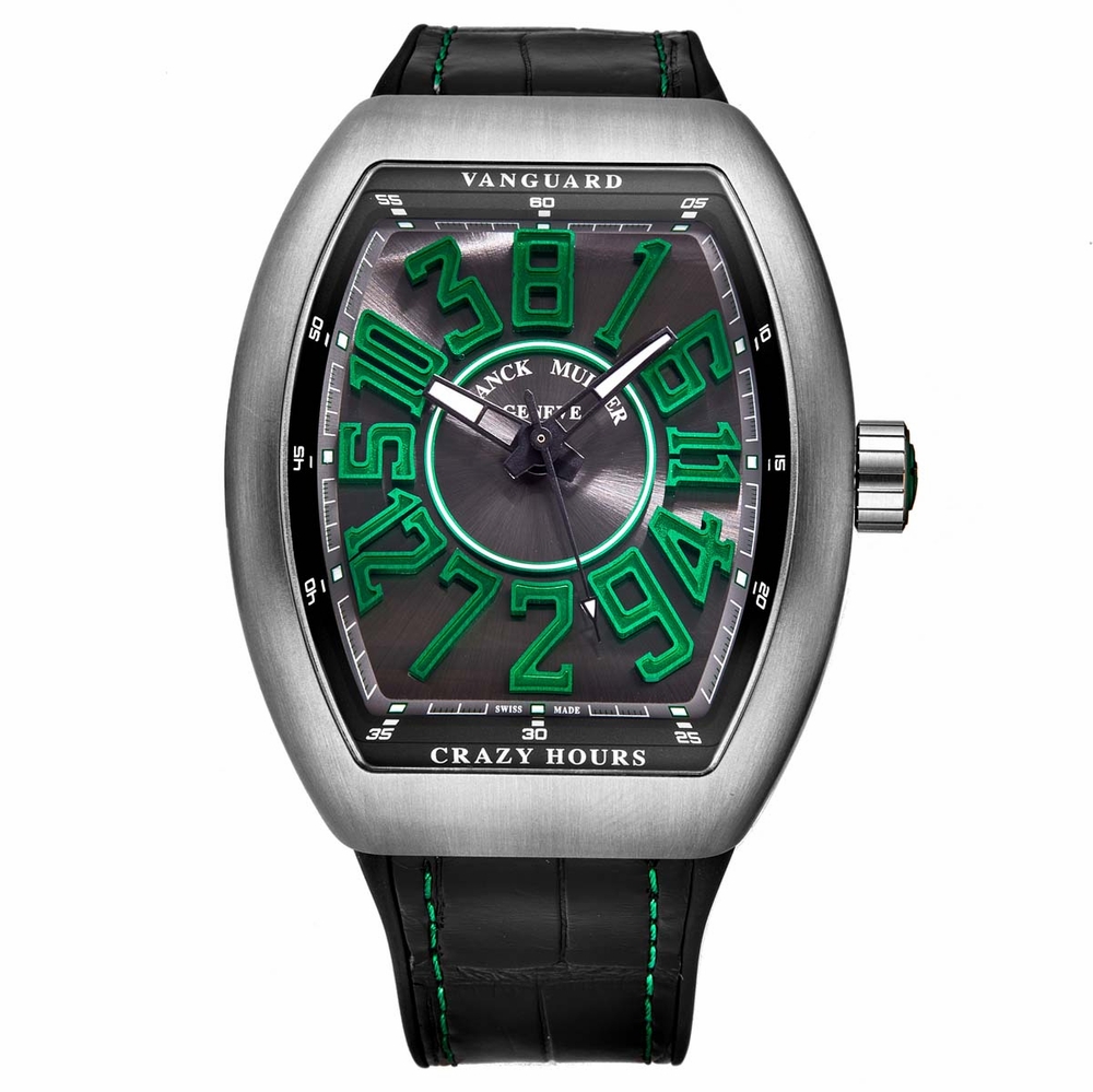 Titanium case with a black rubber strap with a stiched black leather top. Fixed titanium bezel. Black dial with luminous black hands and Arabic numeral hour markers. Arabic numeral minute markers (at 5 minute intervals). Minute markers around the outer rim. Dial Type: Analog. Luminescent hands and markers. Automatic movement. Scratch resistant sapphire crystal. Pull / push crown. Solid case back. Tonneau case shape. Case size: 44 mm. Case thickness: 13.4 mm. Band width: 26 mm. Band length: 8 inches. Deployment clasp. Water resistant at 3 atm/30 meters/100 feet. Functions: crazy hours, minute, second. Vanguard Series. Luxury watch style. Watch label: Swiss Made. Franck Muller Vanguard Automatic Black Dial Mens Watch 45CHTTBRVR.