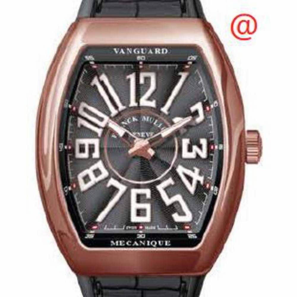Rose gold-tone 18kt rose gold case with a black alligator band. Fixed rose gold-tone 18kt rose gold bezel. Black dial with rose gold-tone hands and Arabic numeral hour markers. Minute markers around the outer rim. Dial Type: Analog. Luminescent hands and markers. Automatic movement. Scratch resistant sapphire crystal. Tonneau case shape, case size: 41 mm. Functions: hour, minute. Additional Info: original box, international warranty card, manual (complete accessories). Vanguard Series. Luxury watch style. Watch label: Swiss Made. Franck Muller Vanguard Automatic Black Dial Mens Watch V41S5NNR(NRBLC5N).