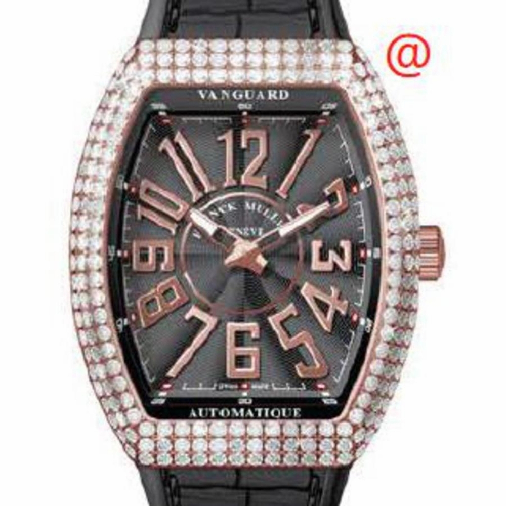 Rose gold-tone 18kt rose gold case with a black alligator band. Fixed rose gold-tone bezel with diamond set 18kt rose gold. Black dial with rose gold-tone hands and Arabic numeral hour markers. Minute markers around the outer rim. Dial Type: Analog. Luminescent hands and markers. Automatic movement. Scratch resistant sapphire crystal. Tonneau case shape, case size: 41 mm. Functions: hour, minute. Additional Info: original box, international warranty card, manual (complete accessories). Vanguard Series. Luxury watch style. Watch label: Swiss Made. Franck Muller Vanguard Automatic Diamond Black Dial Mens Watch V41SATRELD5NNR(NR5N).