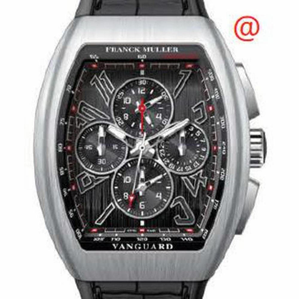 Silver-tone stainless steel case with a black alligator band. Fixed silver-tone stainless steel bezel. Black dial with silver-tone hands and Arabic numeral hour markers. Minute markers around the outer rim. Dial Type: Analog. Luminescent hands and markers. Automatic movement. Scratch resistant sapphire crystal. Tonneau case shape, case size: 45 mm. Functions: month, date, day, hour, minute, second. Additional Info: original box, international warranty card, manual (complete accessories). Vanguard Series. Luxury watch style. Watch label: Swiss Made. Franck Muller Vanguard Automatic Black Dial Mens Watch V45CCMBACBRNR(NRNRACBR).