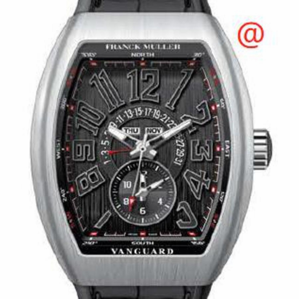 Silver-tone stainless steel case with a black leather strap. Fixed silver-tone stainless steel bezel. Black dial with silver-tone hands and Arabic numeral hour markers. Minute markers around the outer rim. Dial Type: Analog. Luminescent hands and markers. Automatic movement. Scratch resistant sapphire crystal. Tonneau case shape, case size: 45 mm. Functions: date, hour, minute, second. Additional Info: original box, international warranty card, manual (complete accessories). Vanguard Series. Luxury watch style. Watch label: Swiss Made. Franck Muller Vanguard Automatic Black Dial Mens Watch V45MCMBACBRNR(NRNRACBR).